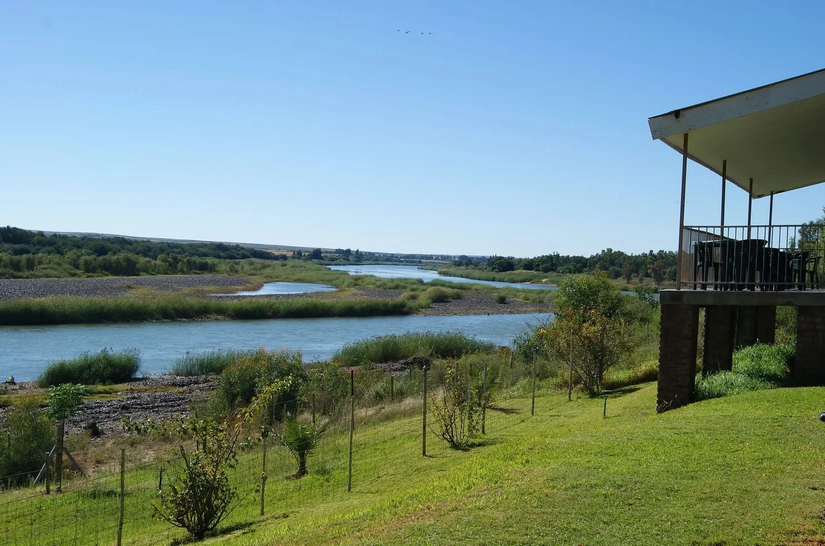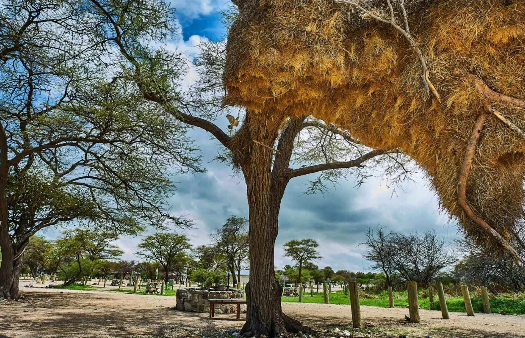 We rijden door Namibië via Windhoek terug naar het zuiden. We logeren in een bungalow in een park aan een groot meer.