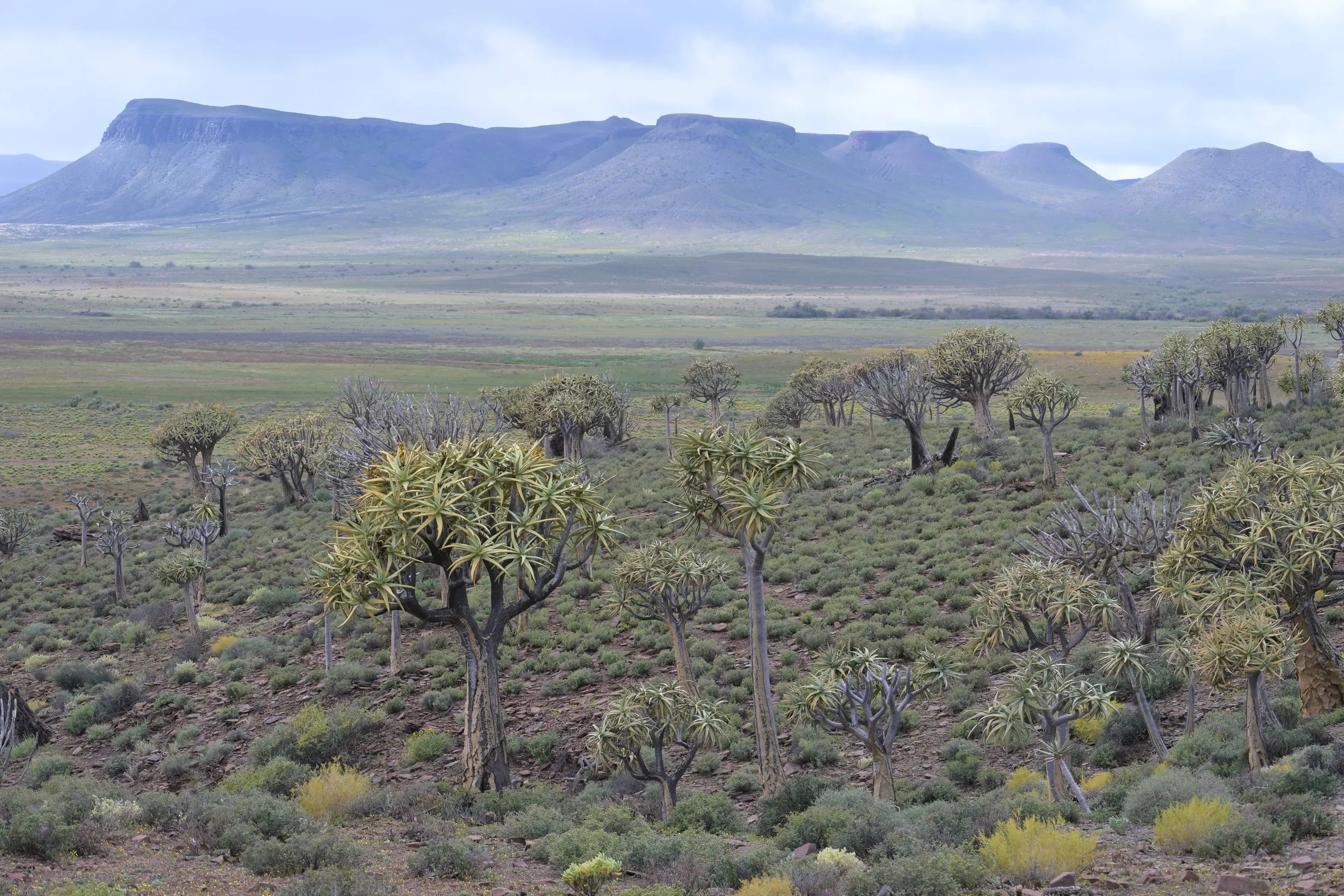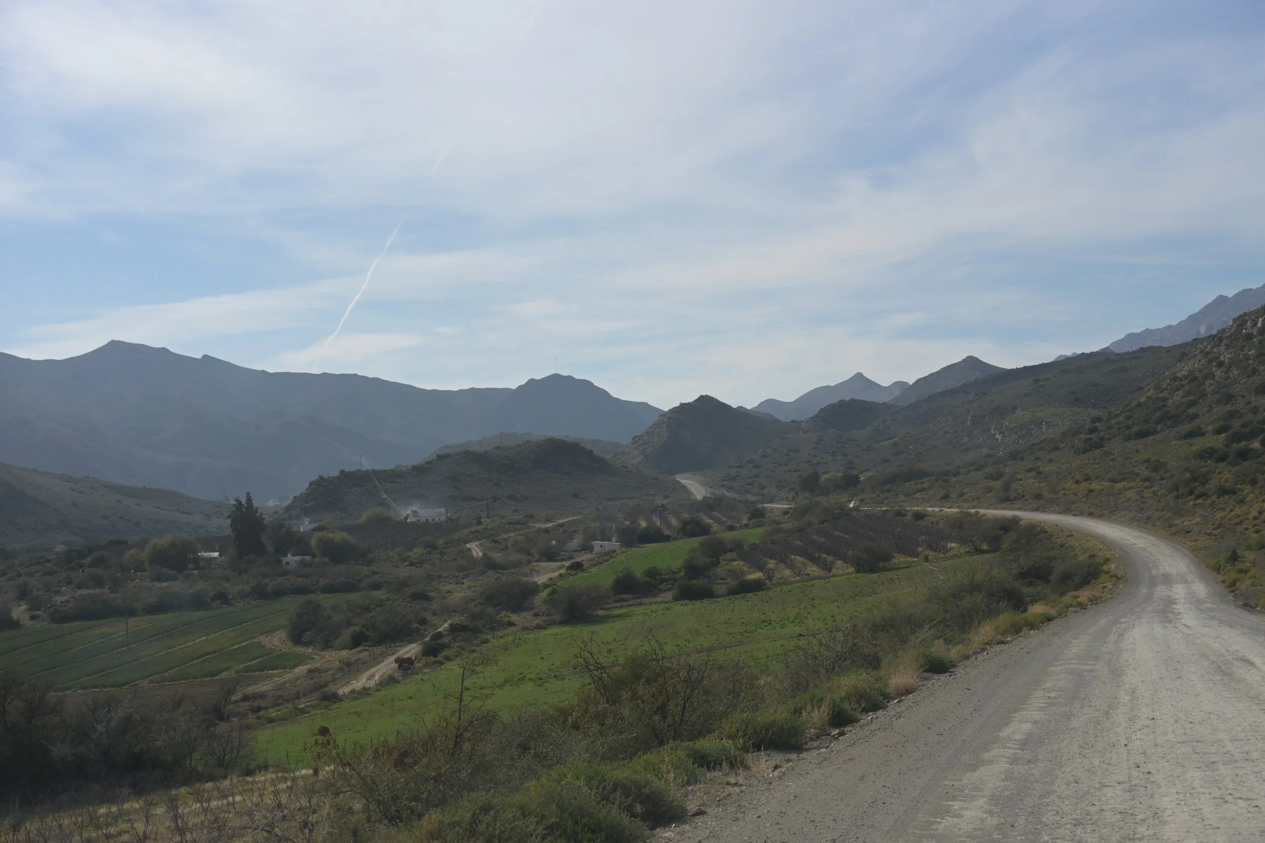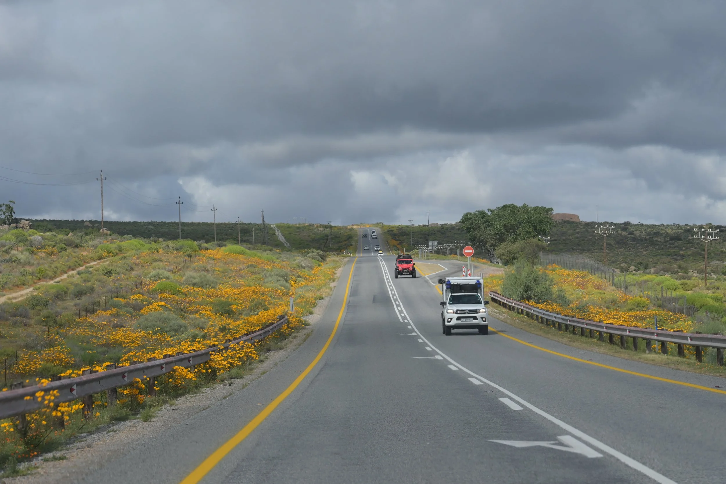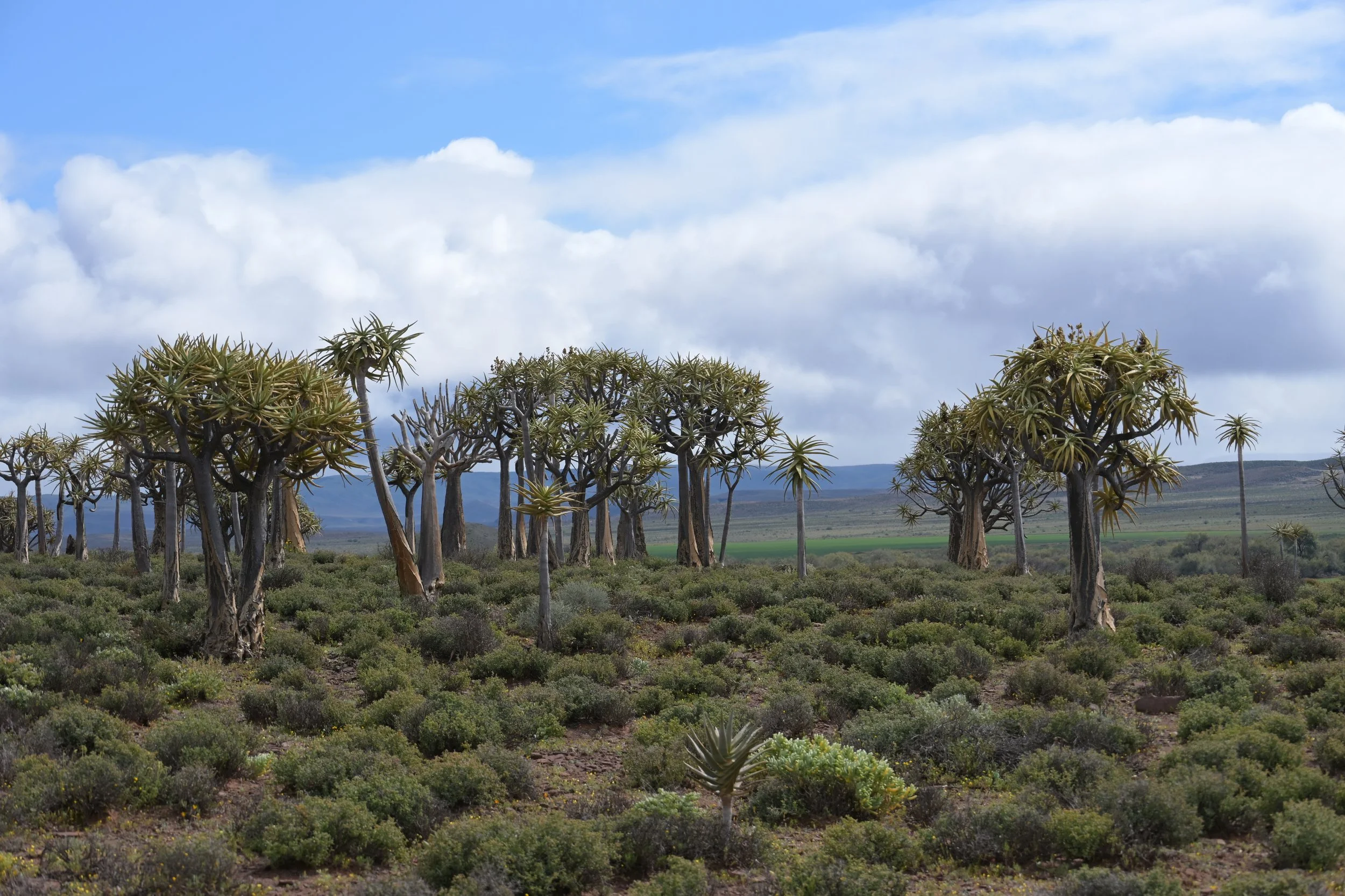 Op weg naar Nieuwoudtville. Deze streek staat bekend om de overvloed aan natuurlijke (bol)bloemenin het voorjaar. Dat is wel afhankelijk van de hoeveelheid regen die in de periode hiervoor is gevallen. Hoeveel bloemen je ziet is ook afhankelijk van de zonneschijn op die dag. Sommige bloemen openen zich alleen als de zon schijnt.