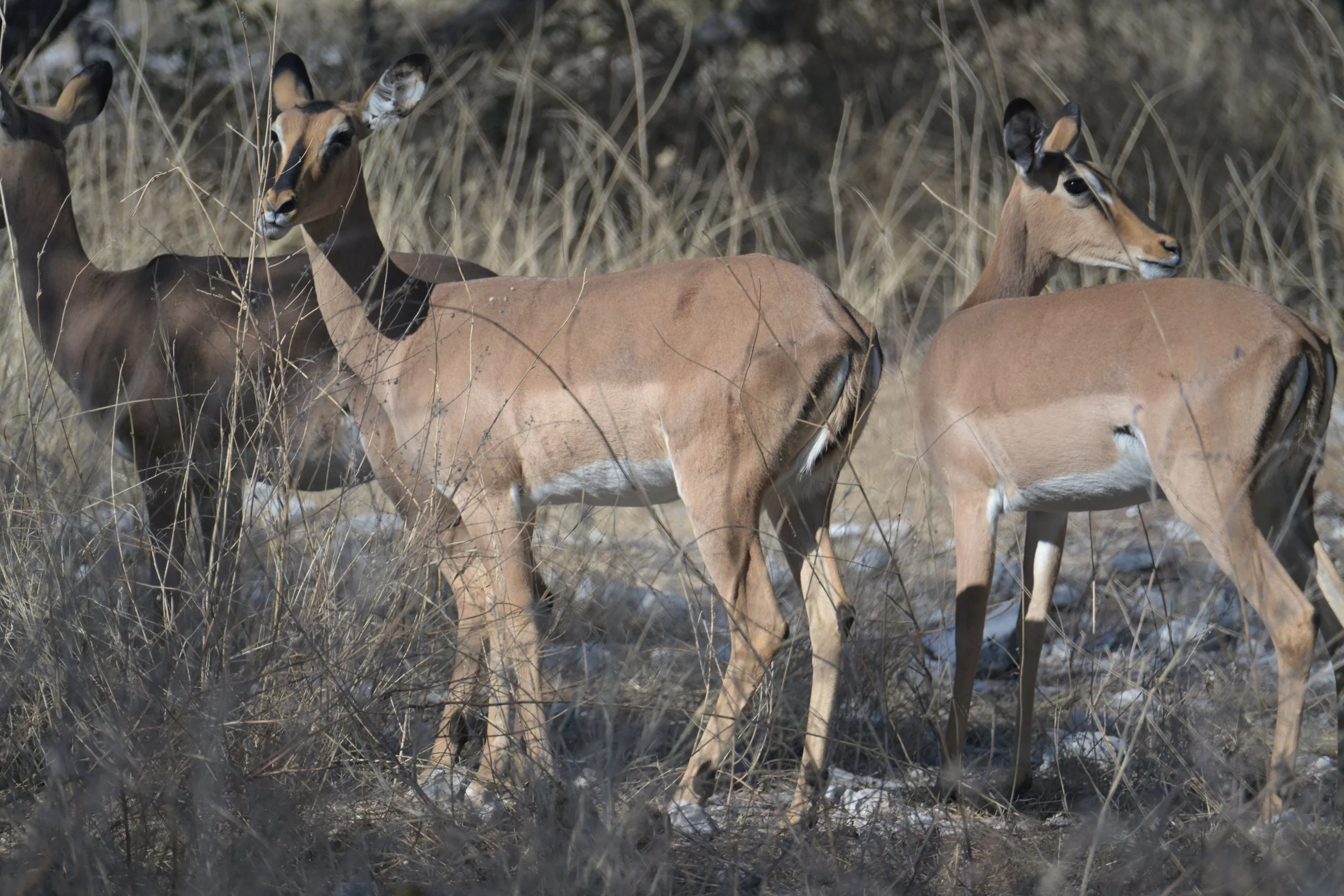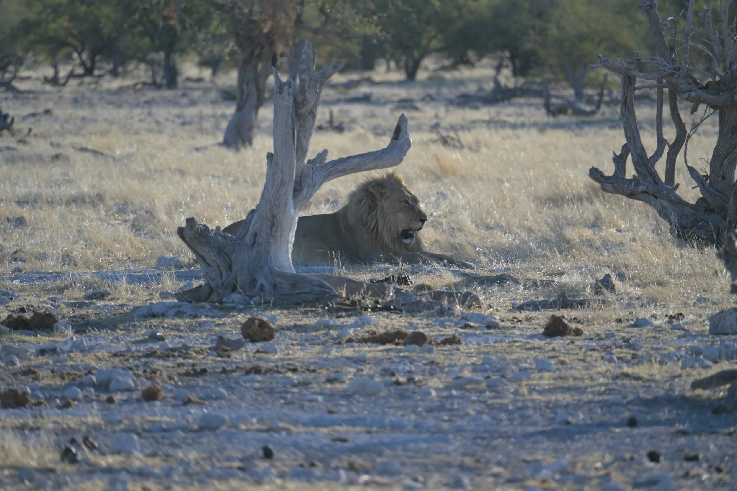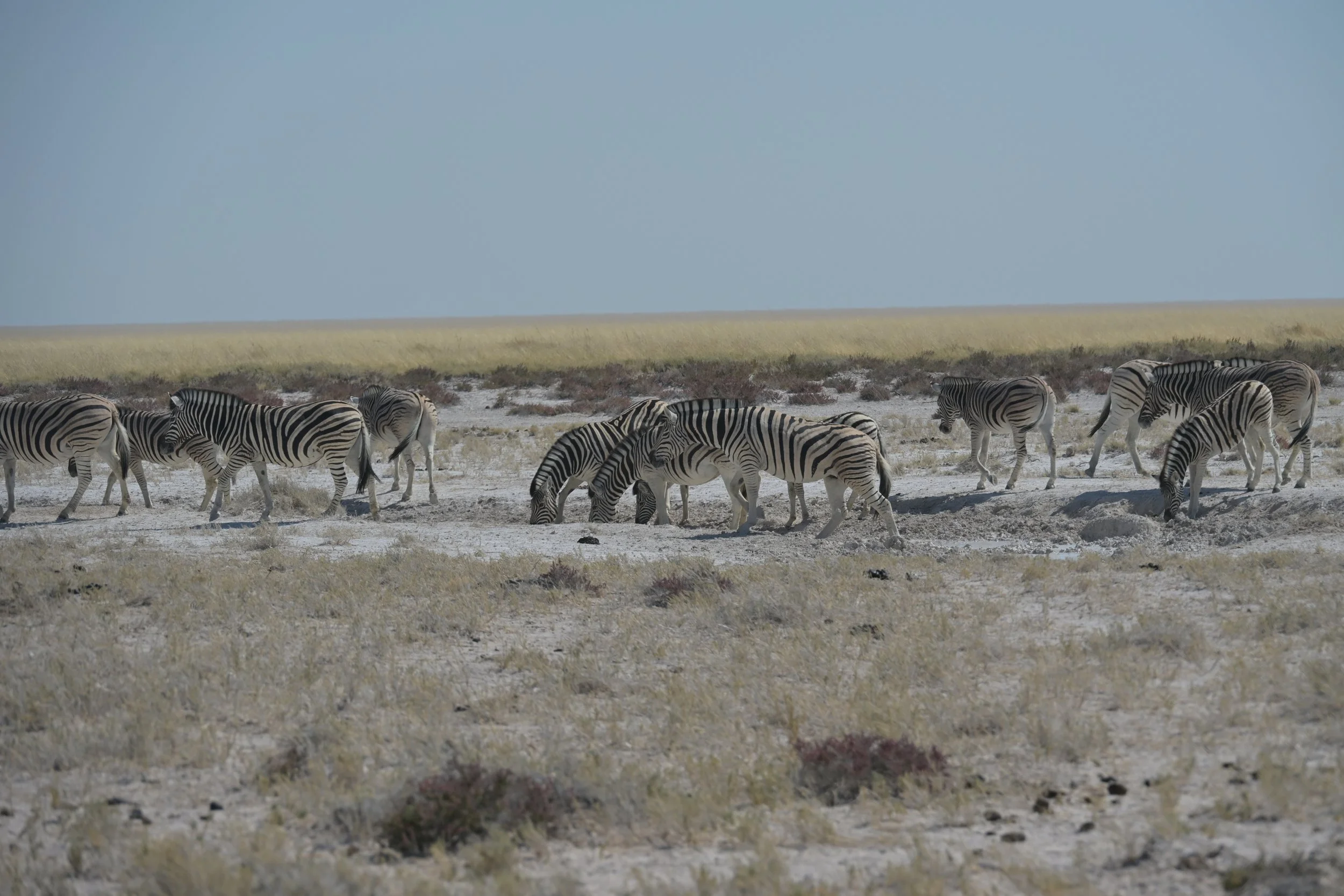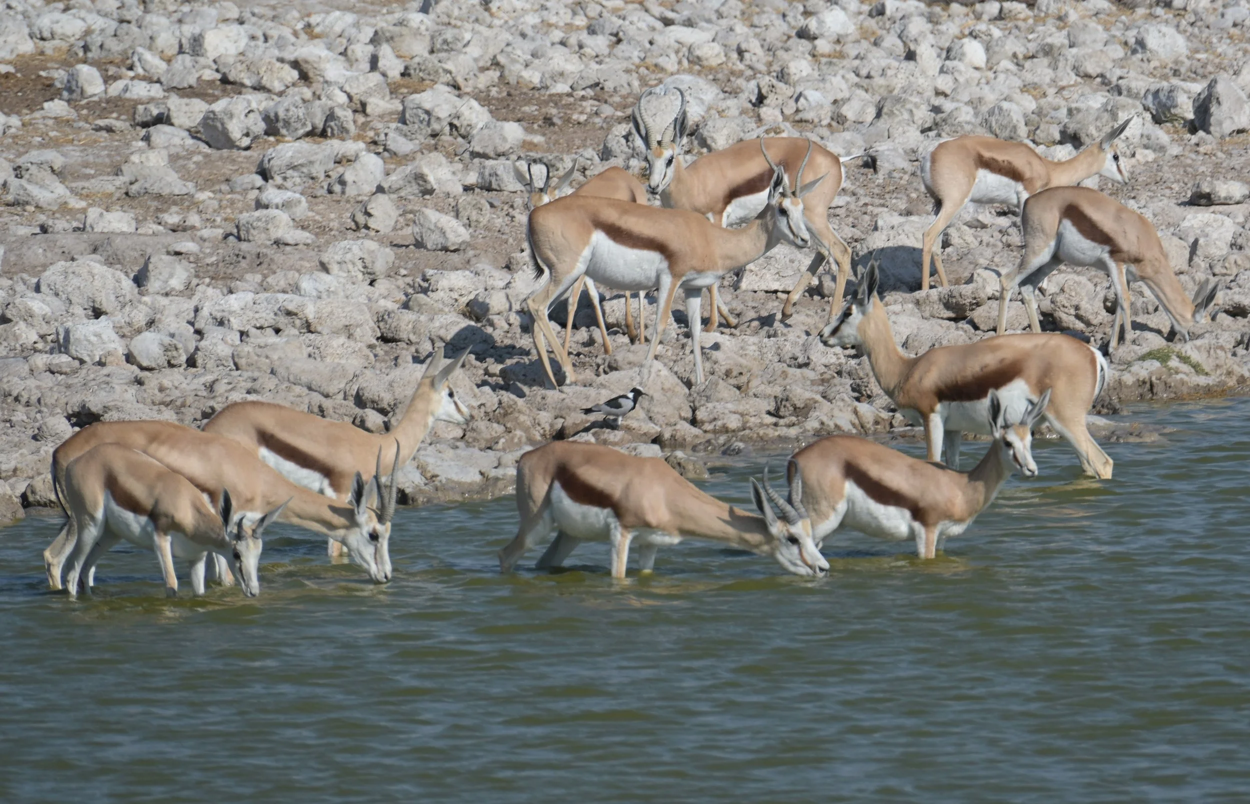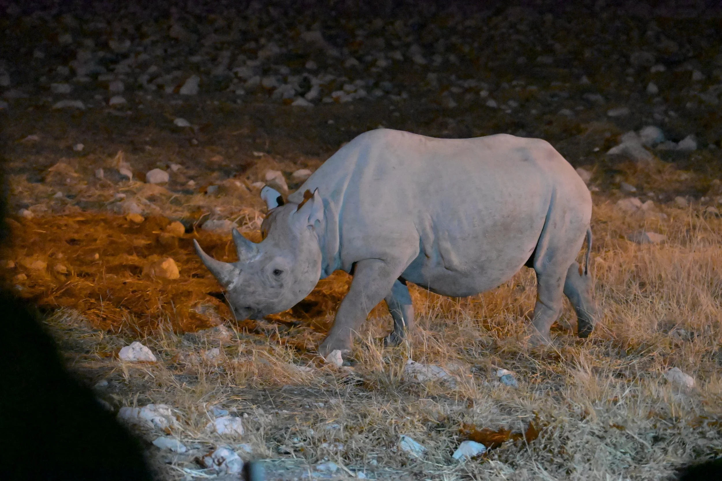 Daarna rijden we zelf door naar Etosha, het wereldberoemde nationaal park. Het park bestaat uit een grote zoutpan en een gebied van droge savanne daaromheen. Bij het kamp waar we verblijven is een waterhole waar 24 uur per dag dieren naar toe kunnen komen. In de avond zien we maar liefst 8 neushoorns.
