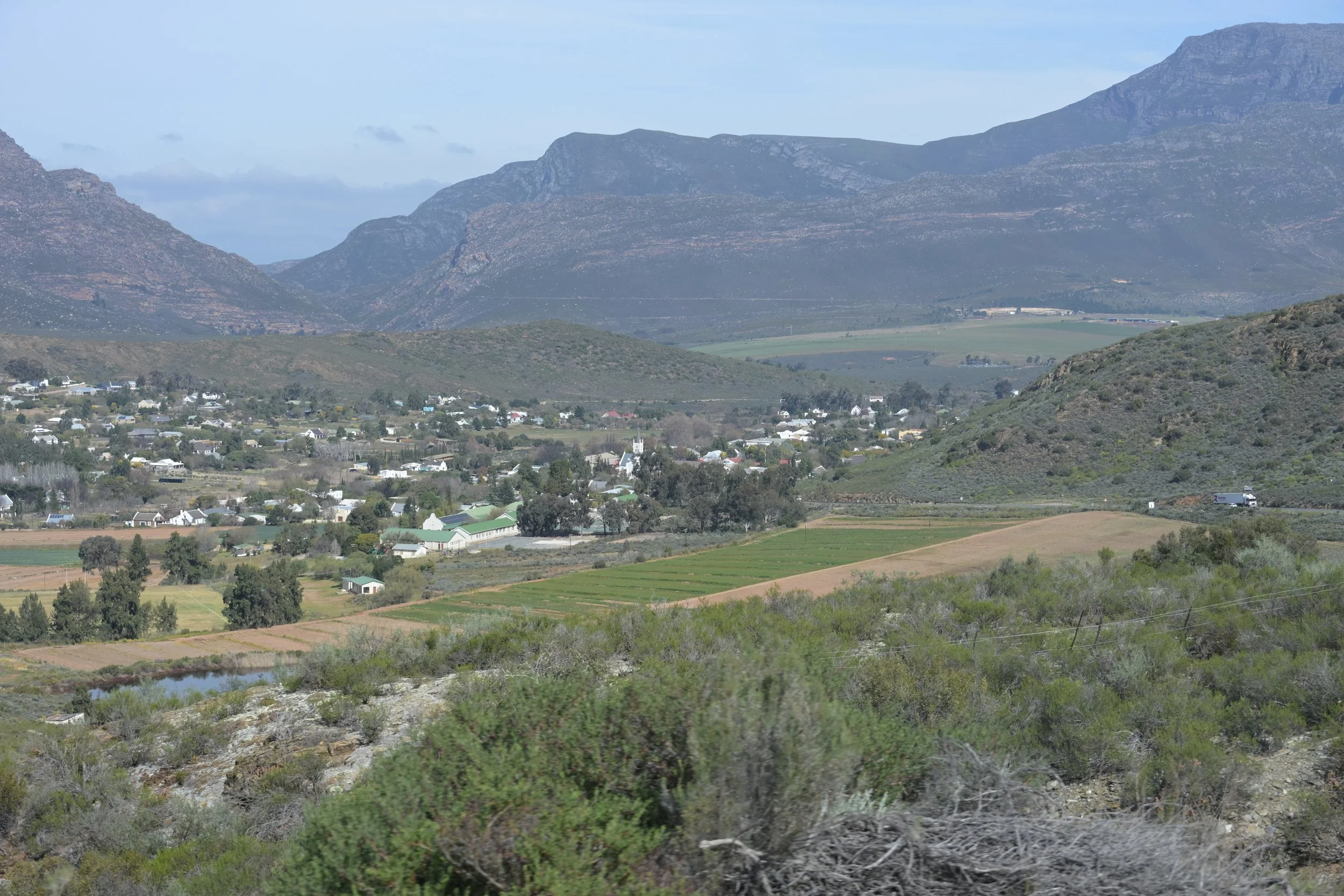 Op weg naar de Indische Oceaan. Om daar te komen moeten we over of door de Swartbergen. We nemen de Seweweeks Poort, het is een indrukwekkende doorgang door de bergen waarbij je tekens denkt dat het niet verder gaat. Als we daar doorheen zijn rijden we een stukje van de bekende route 62, o.a. via Barrydale. Boodschappen doen we in Swellendam, de op-2-na oudste stad van Z-A. We rijden uiteindelijk naar Franskraal bij Gansbaai.